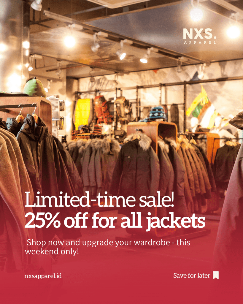 Attention shoppers! Limited-time sale! Get 25% off for all jackets 🧥. Shop now and upgrade your wardrobe—this weekend only! Don't miss out on ..